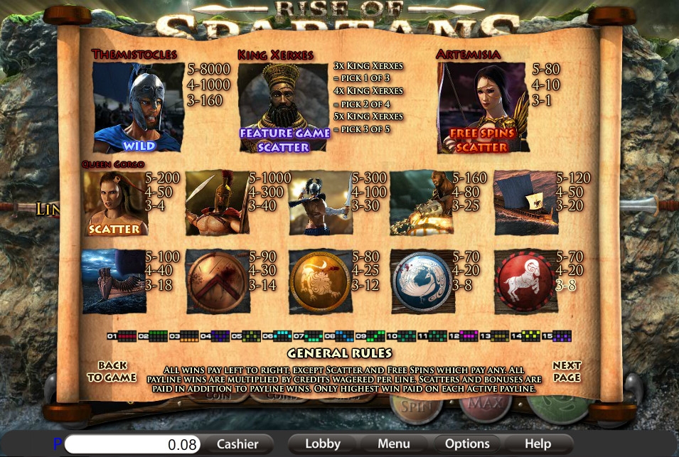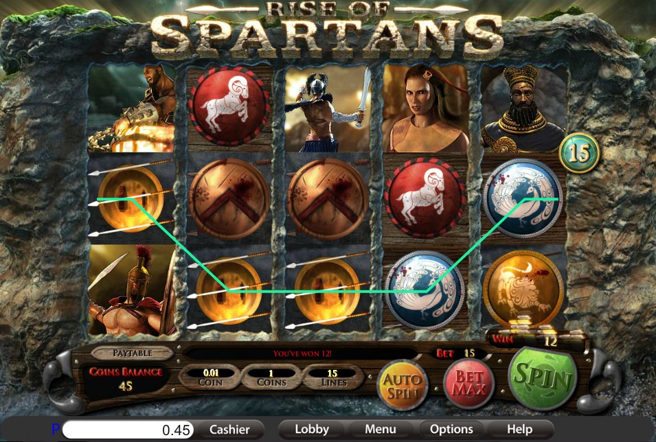 Вы сможете играть на игровом автомате Rise of Spartans по любому количеству активных линий вплоть до пятнадцати. Ставка на каждую из этих позиций может достигать пяти монет номиналом 0.01, 0.05, 0.10 или 0.25 евро. На один раунд принимается до 18.75 евро.