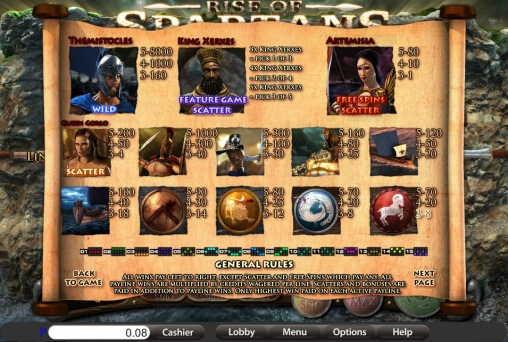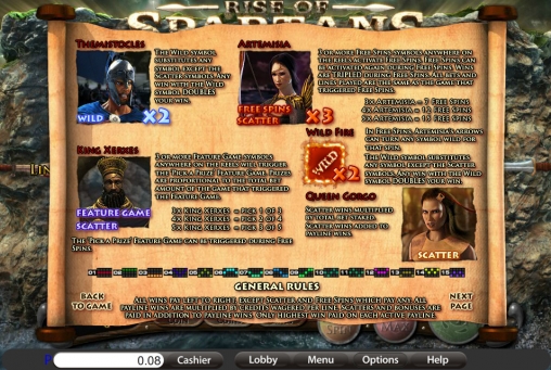 игровой автомат Rise of Spartans, вы увидите на его барабанах воинов-спартанцев и их щиты. В роли специальных символов выступают Wild, Scatter, Free Spins Scatter и Feature Game Scatter. На них изображены различные исторические персонажи. Вы узнаете все эти картинки по соответствующим надписям.