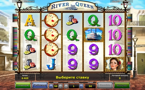 Шулер, карты, фишки, кости и написанные в старинном стиле номиналы карт от девятки до туза – таков набор базовых картинок в видео-слоте River Queen. Они располагаются на барабанах полосами, поэтому не только целая колонка, но и весь экран может быть занят одинаковыми элементами, что дает максимально возможное количество комбинации в одном спине.