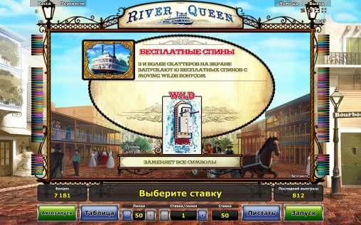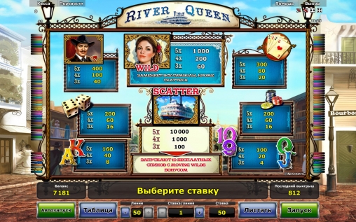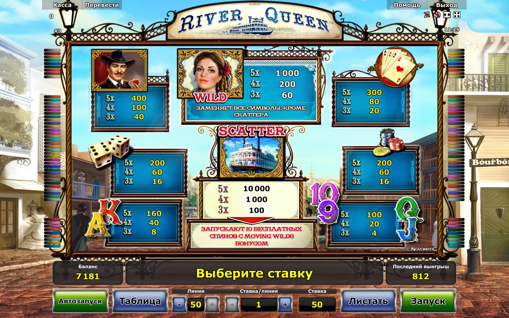River Queen представляет собой пятибарабанный автомат, на экране которого одновременно можно увидеть двадцать картинок (5х4). Клиенты могут играть по одной – пятидесяти активным полосам, сделав на них ставки равного размера. Диапазон простирается от одного до двухсот кредитов, а на раунд принимается до десяти тысяч.