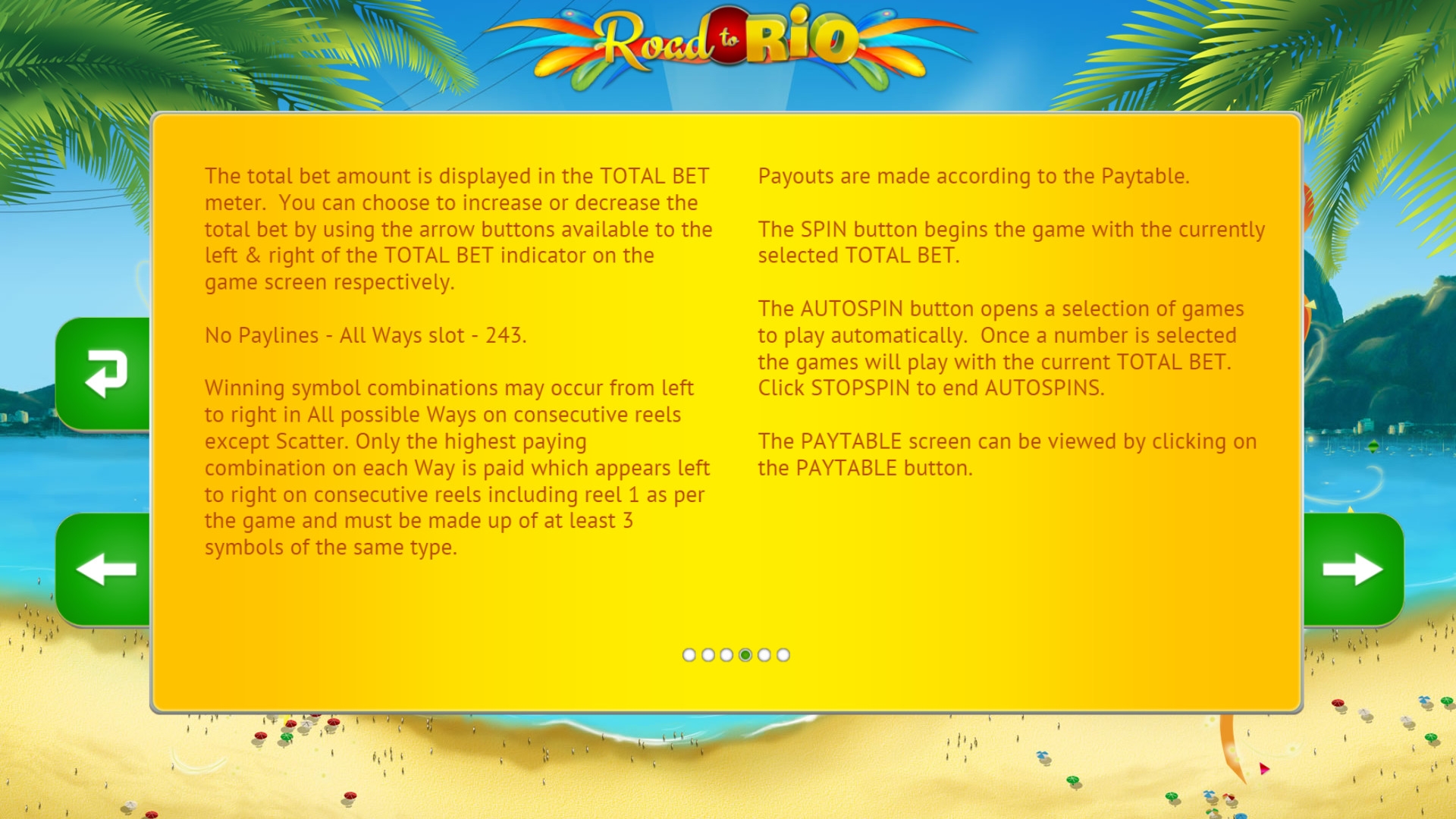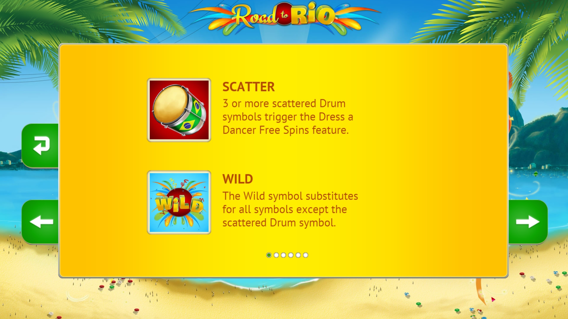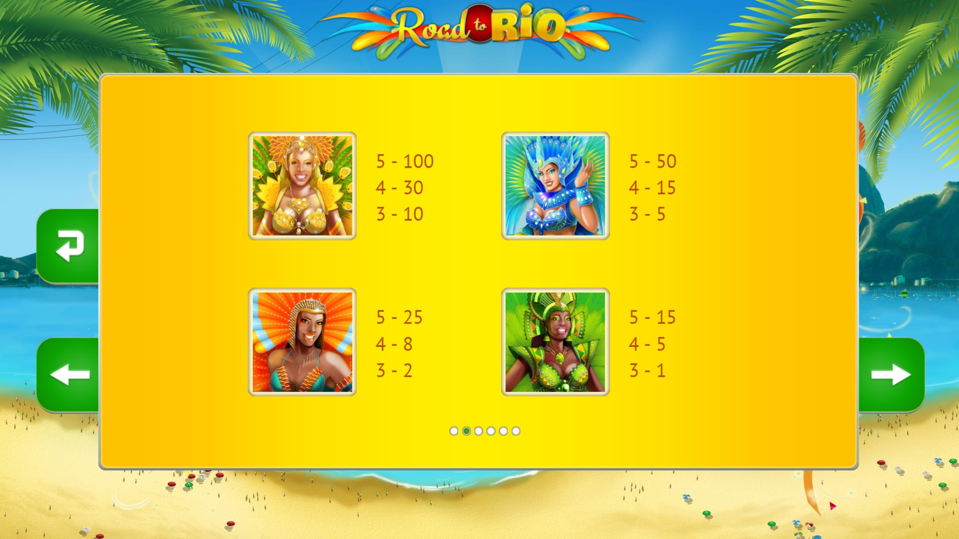 видео-слота Road to Rio имеет вид фри-спинов. Их началу предшествует появление стартового экрана, где вам нужно будет выбирать элементы одежды танцовщицы. Каждый предмет, на который вы укажете, принесет либо определенное количество бесплатных вращений, либо дополнительный множитель, который будет участвовать в расчете выплат.