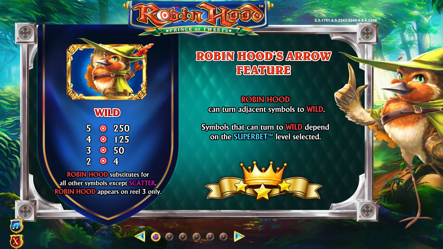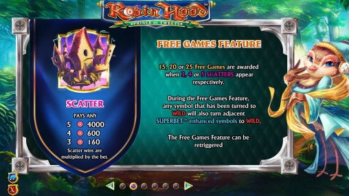 - Robin Hood’s Arrow – Главный герой может выпускать стрелы по некоторым символам, которые его касаются, превращая их в Wild. При обычной ставке он может это проделывать лишь с принцессой. Если включена SuperBet первого уровня, трансформироваться могут три персонажа. Активная SuperBet второго уровня позволяет превращать шесть разных картинок (детали в правилах).