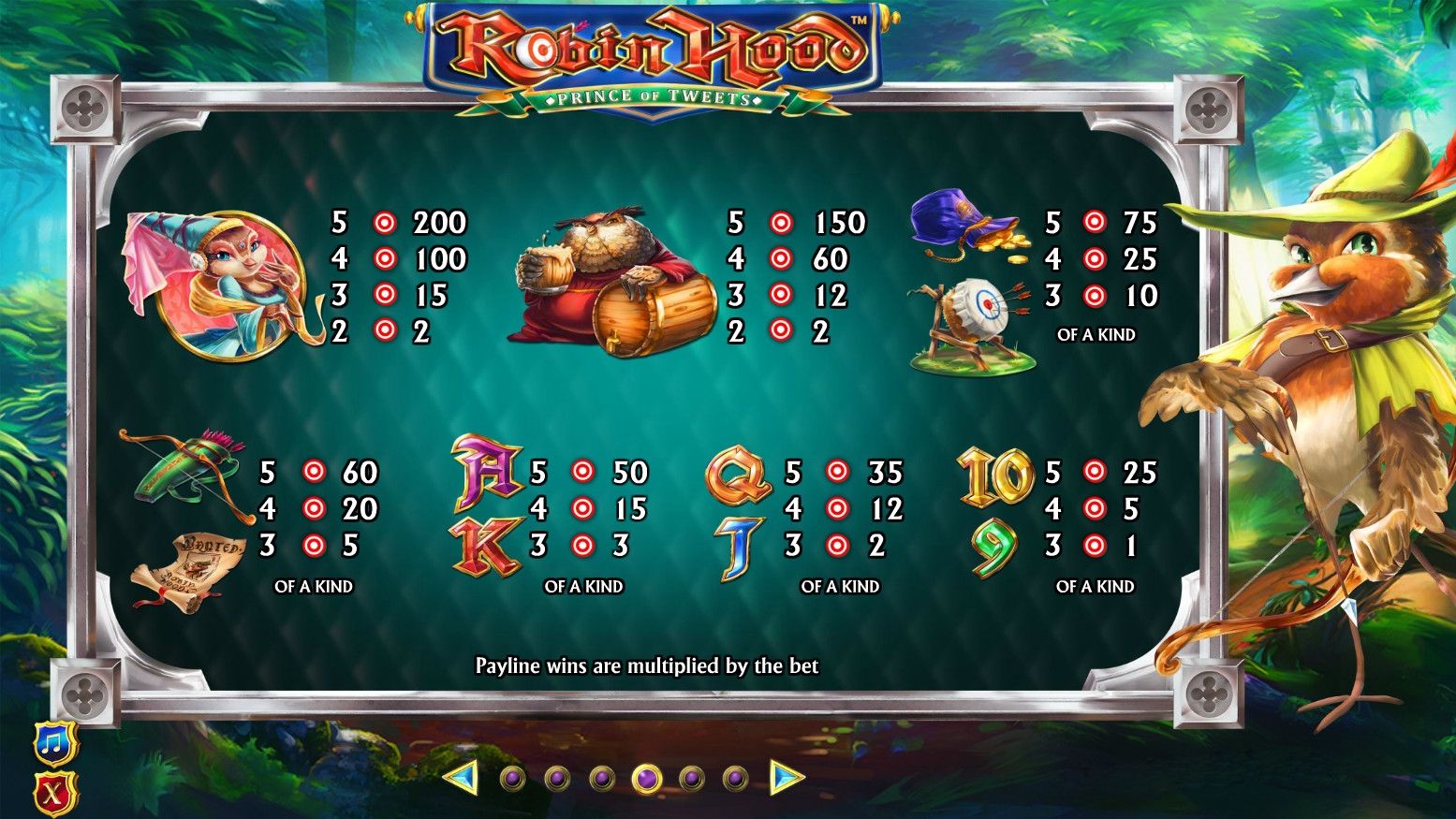Robin Hood: Prince of Tweets – слот с пятью барабанами и двадцатью картинками на главном экране. Играть можно только по сорока активным полосам, но ставка всегда кратна двадцати монетам.