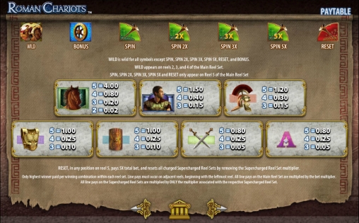 Теперь рассмотрим особенности специальных символов Wild (римский легионер на колеснице), Bonus (колесо), Spin, Spin 2x, Spin 3x и Spin 5x (труба на зеленом фоне с соответствующим множителем), а также Reset (труба на красном фоне).
