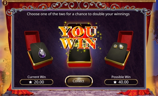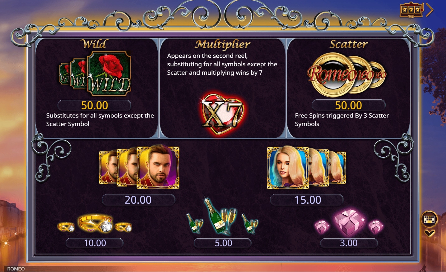 На барабанах игрового аппарата «Ромео» вы увидите главных героев пьесы Шекспира, коробку с подарком, кольцо с бриллиантом и шампанское. Одинаковые символы изображены вертикальными стеками, что позволяет им заполнять колонки на экране.