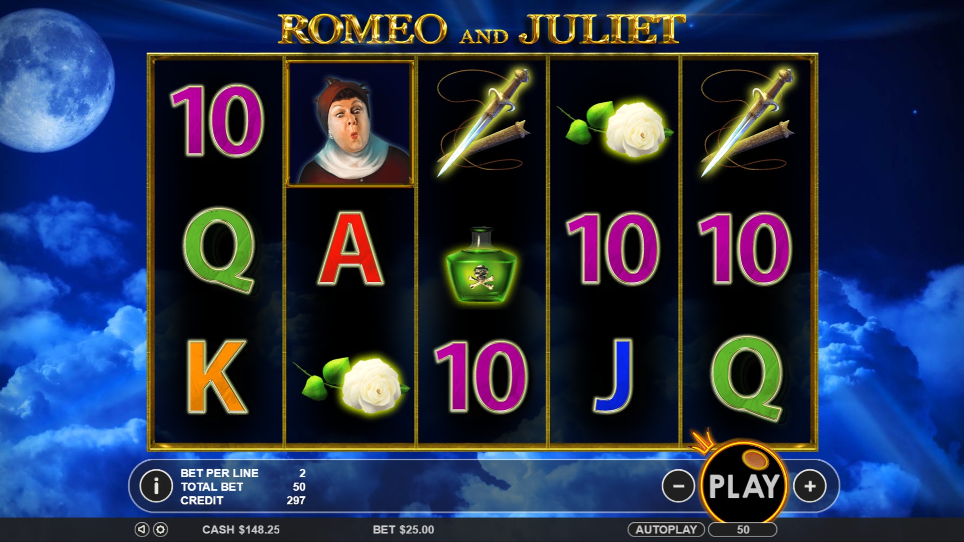 На экране видео-слота «Ромео и Джульетта» появляются персонажи трагедии, бутылочка с ядом, кинжал, белая роза и номиналы карт от десятки до туза.