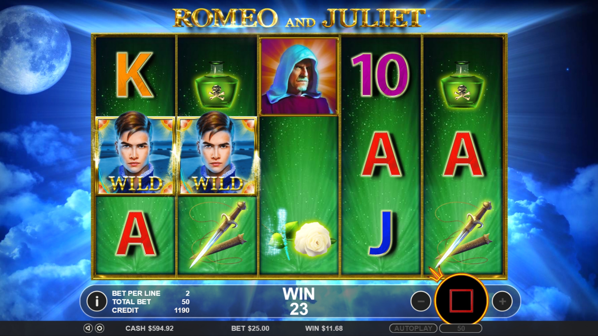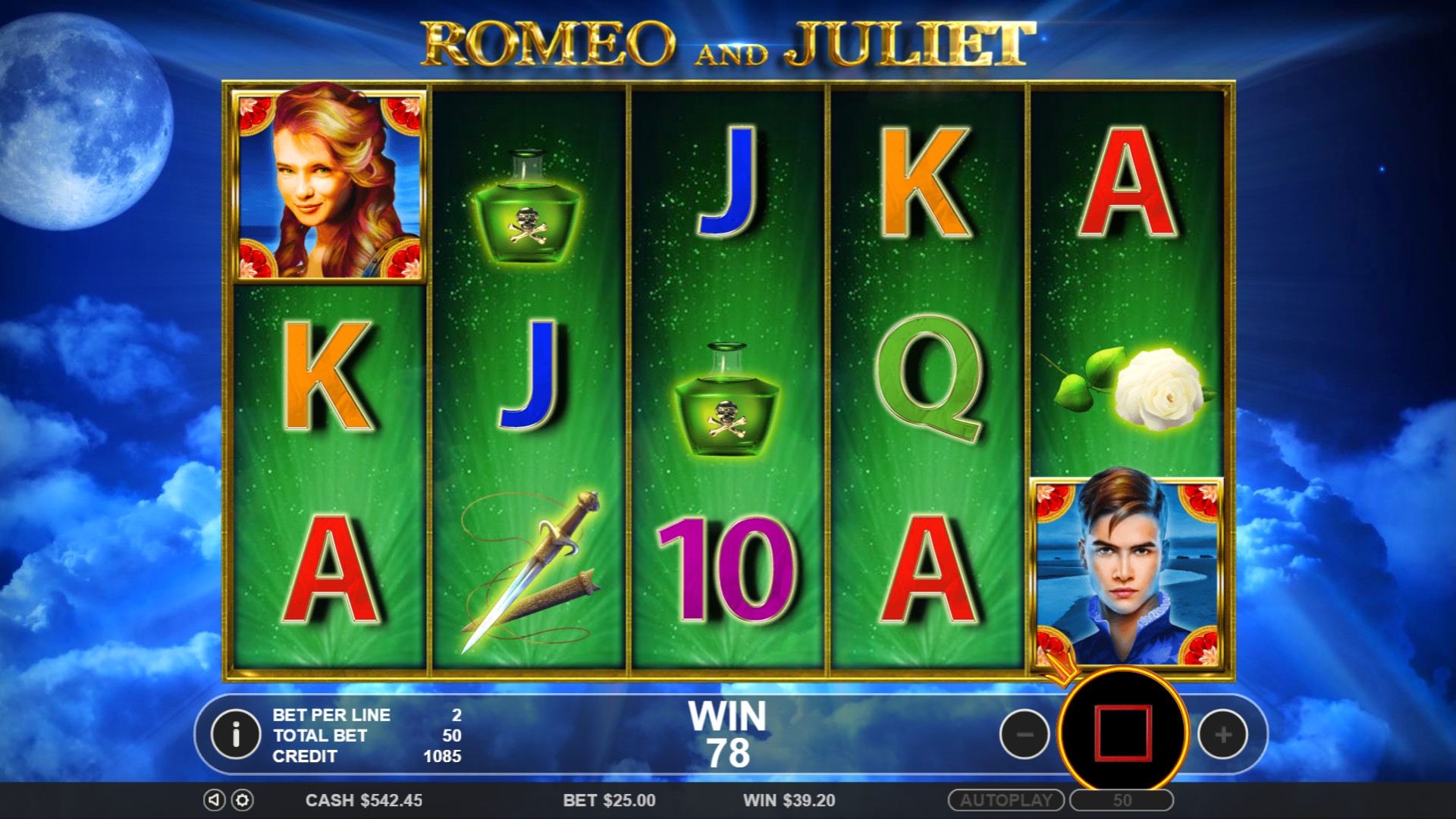 главные герои Шекспира радуют нас и в игровом автомате, по структуре - 5 барабанов, 15 картинок, удобный и радужный интерфейс. Есть раунд фри-спинов. Прогрессивного джекпота не предусмотрено. понравилось, рекомендую