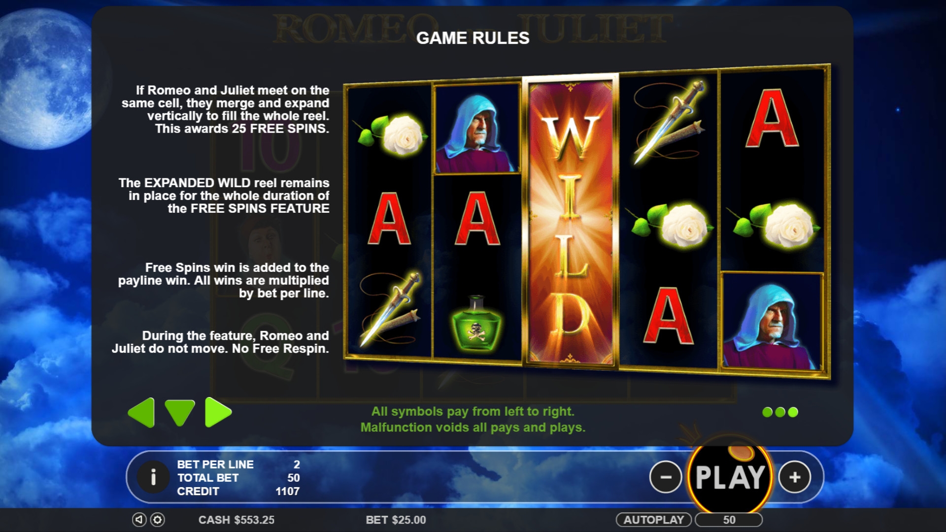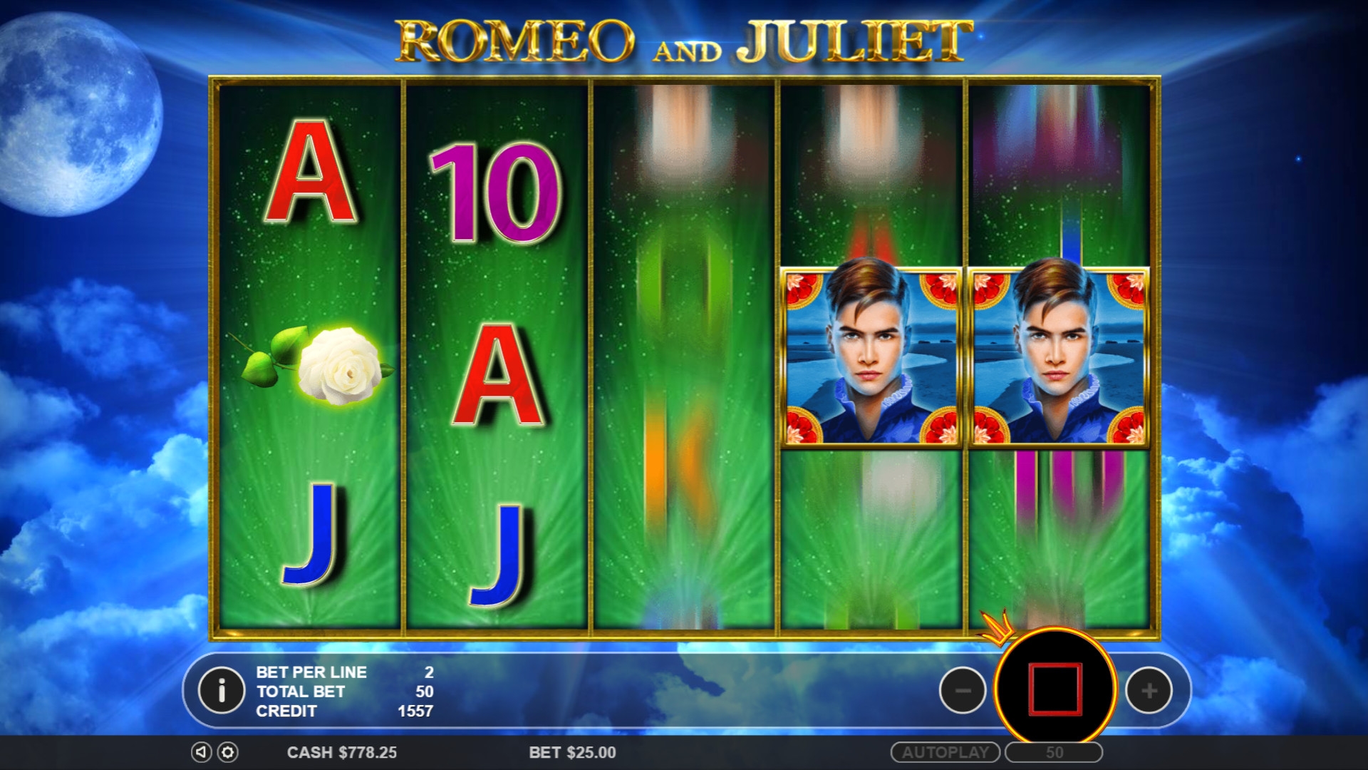 В каждом вращении Ромео сдвигается на одну позицию вправо, а Джульетта перемещается на один барабан влево. Фри-спины продолжаются, пока они не исчезнут за пределами экрана.
