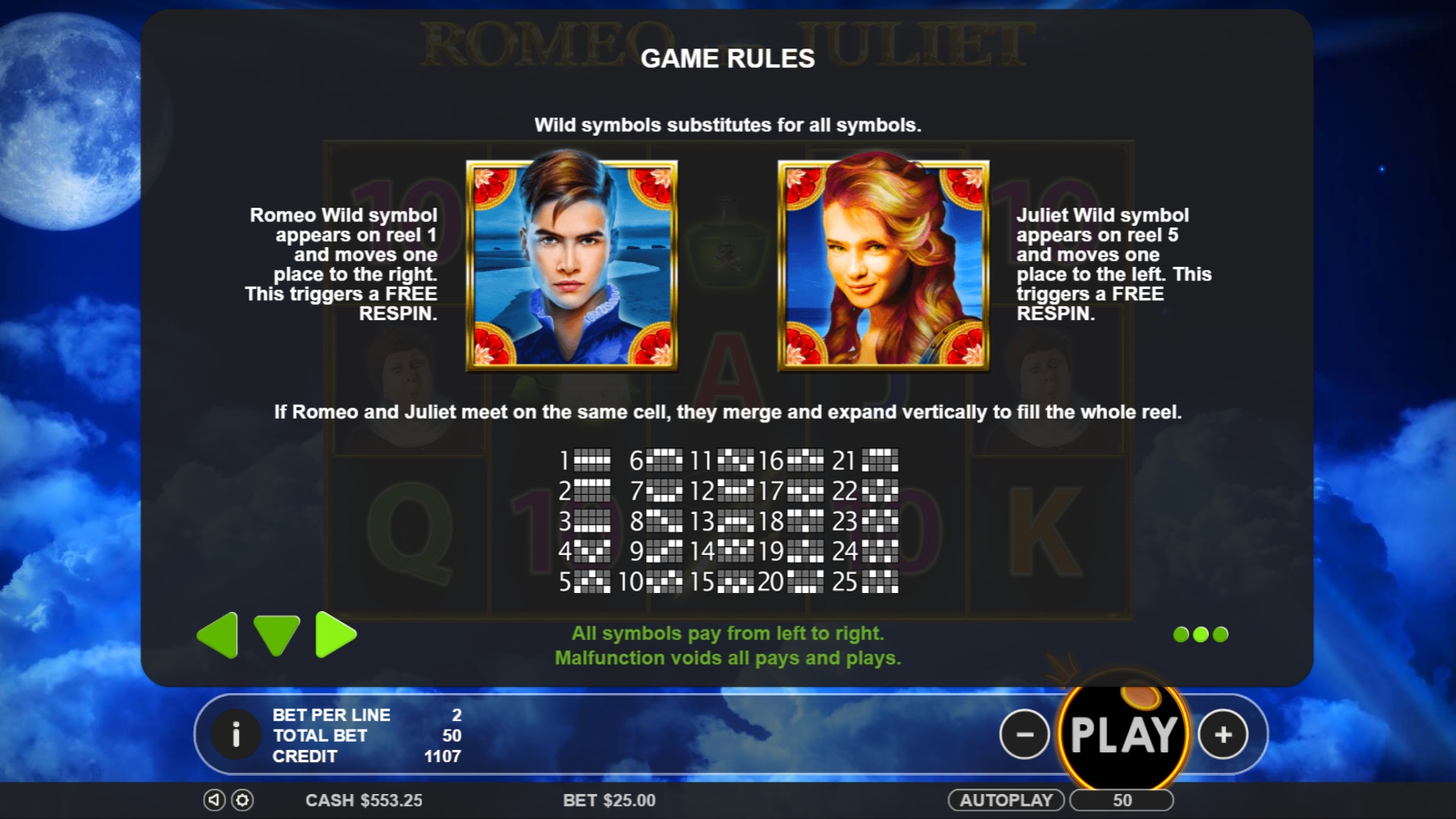 «Ромео и Джульетта» является пятибарабанным видео-слотом с пятнадцатью картинками на основном экране. Играть можно лишь по двадцати пяти активным полосам, на которых формируются оплачиваемые цепочки из картинок.