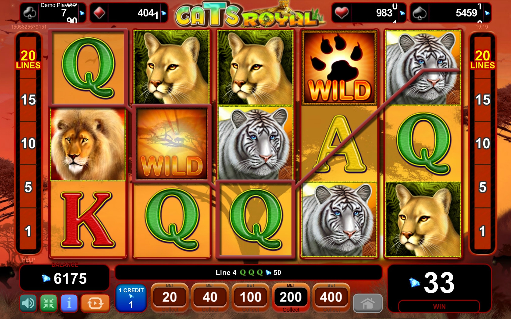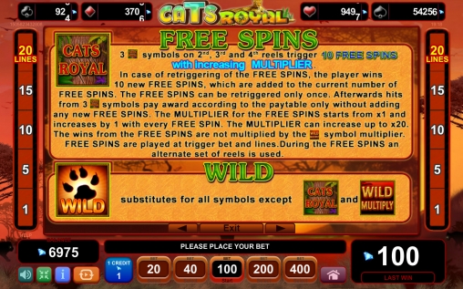 В Royal Cats пять барабанов, двадцать линий и пятнадцать картинок на экране. Вы сможете задействовать одну, пять, десять, пятнадцать или двадцать полос для формирования на них выигрышных цепочек.