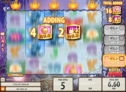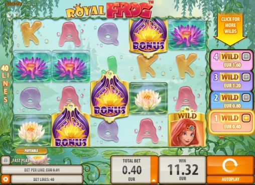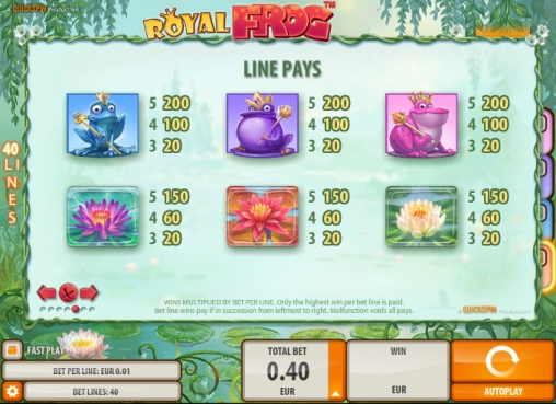 В Royal Frog пять барабанов и сорок линий. Картинки размещаются на экране в четыре ряда. Играть на игровом автомате вы сможете только по сорока активным линиям, поставив на каждую позицию от одного цента до десяти евро. Выходит, что на спин принимается до четырехсот евро.