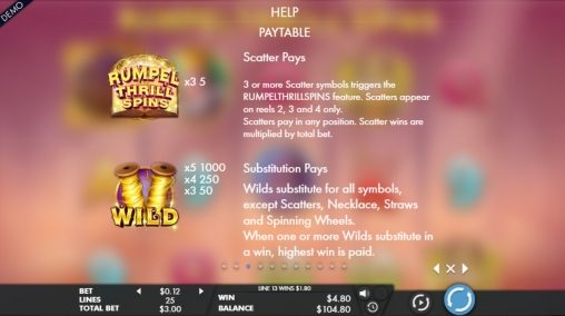 - Scatter (логотип Rumpel Thrill Spins) изображен на втором, третьем и четвертом барабанах. Когда он выпадает сразу в трех колонках, игрок получает выплату в размере пяти общих ставок, после чего начинаются фри-спины.