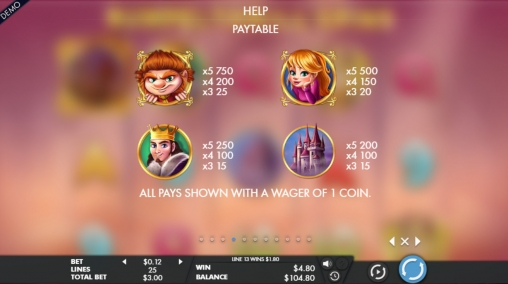 На экране видео-слота появляются карлик, девушка, король, замок, а также шесть букв и цифр, обозначающих номиналы игральных карт.