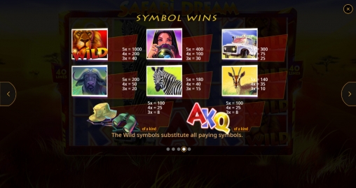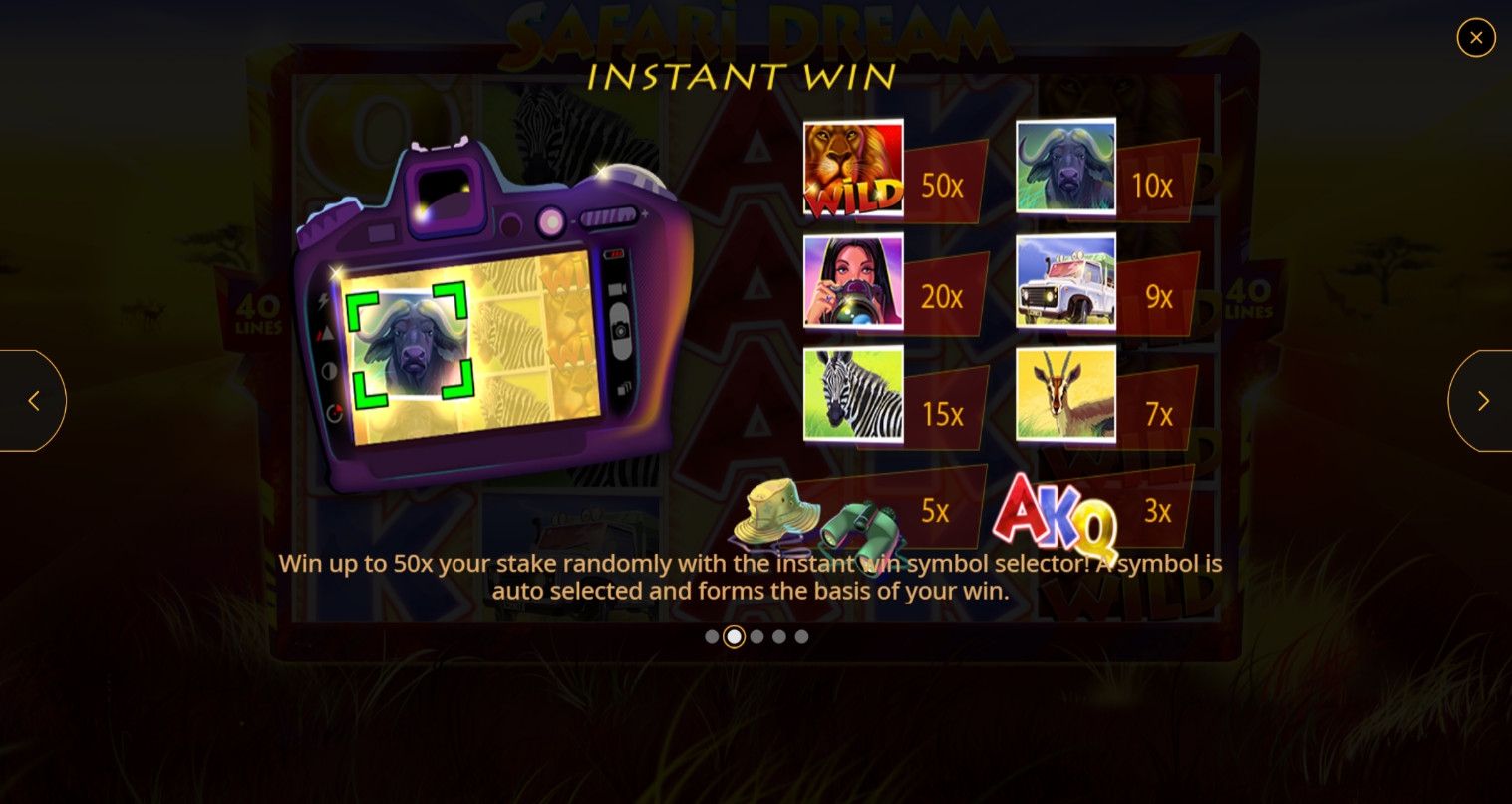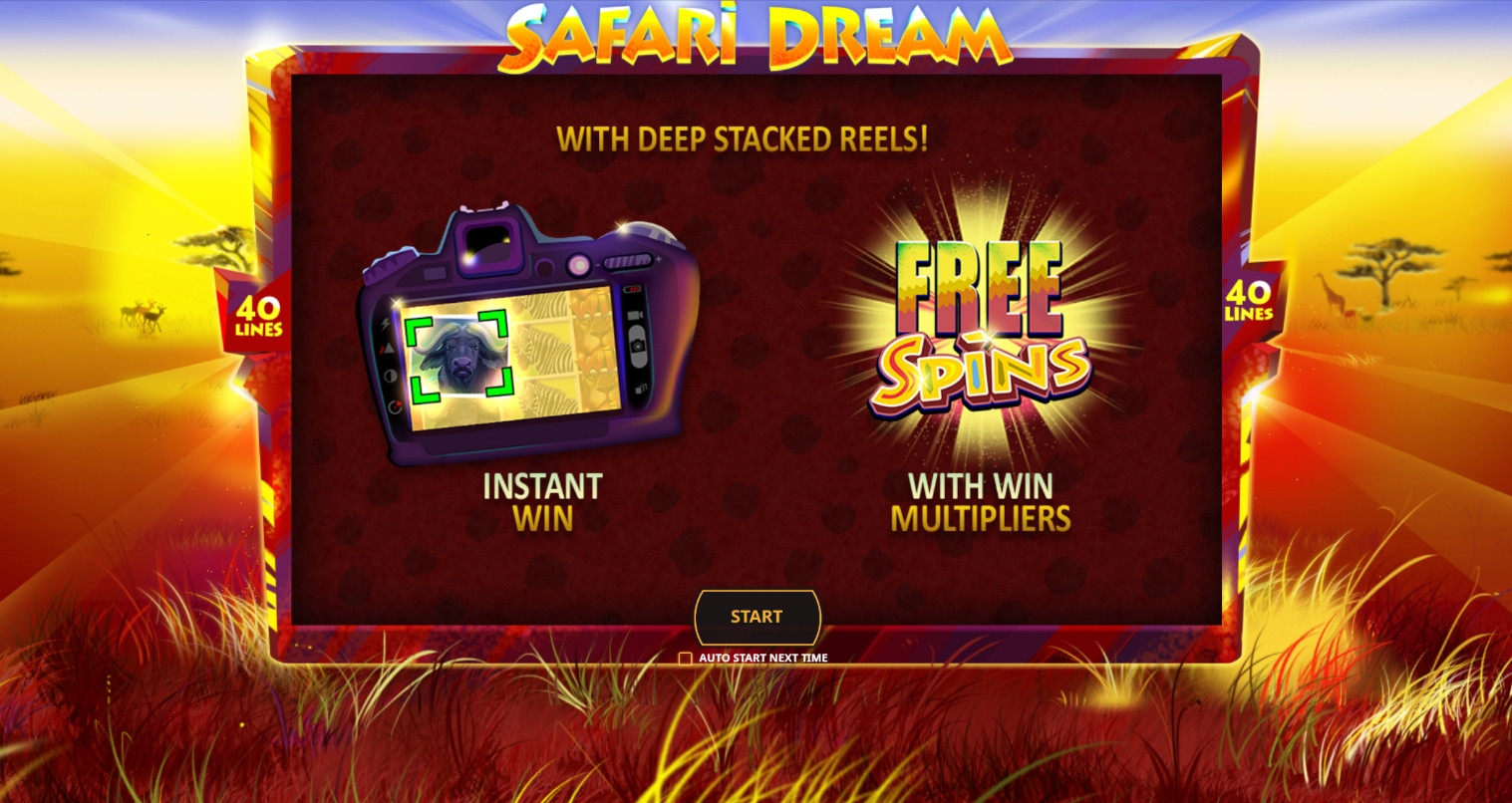 Видео-слот Safari Dream имеет пять барабанов и сорок постоянно задействованных линий. Иконки на главном экране выстраиваются по сетке 5х4.