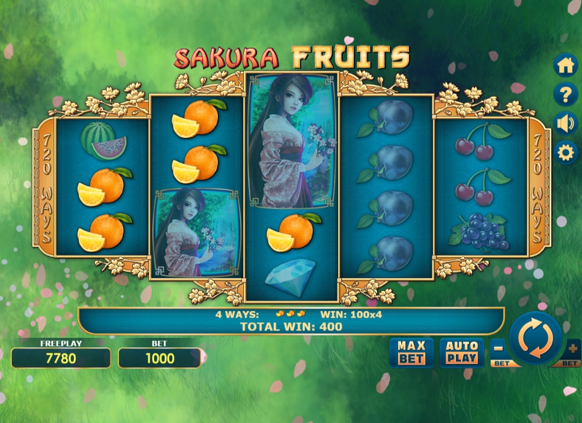 Sakura Fruits – видео-слот с пятью барабанами, в котором отсутствуют активные линии. Комбинации составляются 720 способами из картинок, выпадающих в любых ячейках соседних колонок.