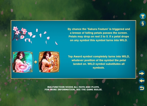 - Sakura Feature может начаться в обычном спине без дополнительных условий. Ветер пронесет по экрану лепестки. Они осядут в разных ячейках на втором – пятом барабанах. Эти символы станут джокерами. Они будут помогать составлять комбинации.