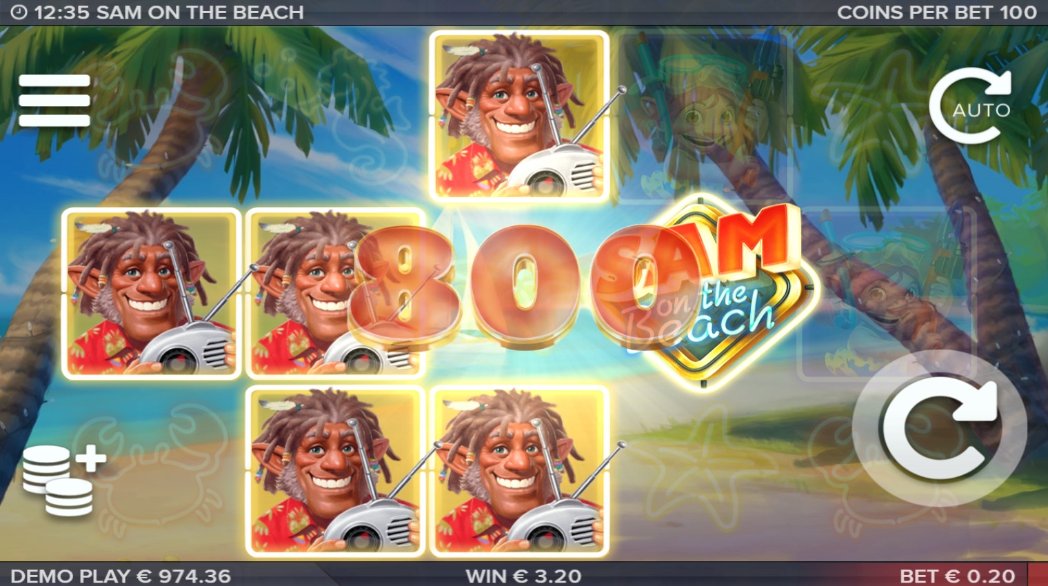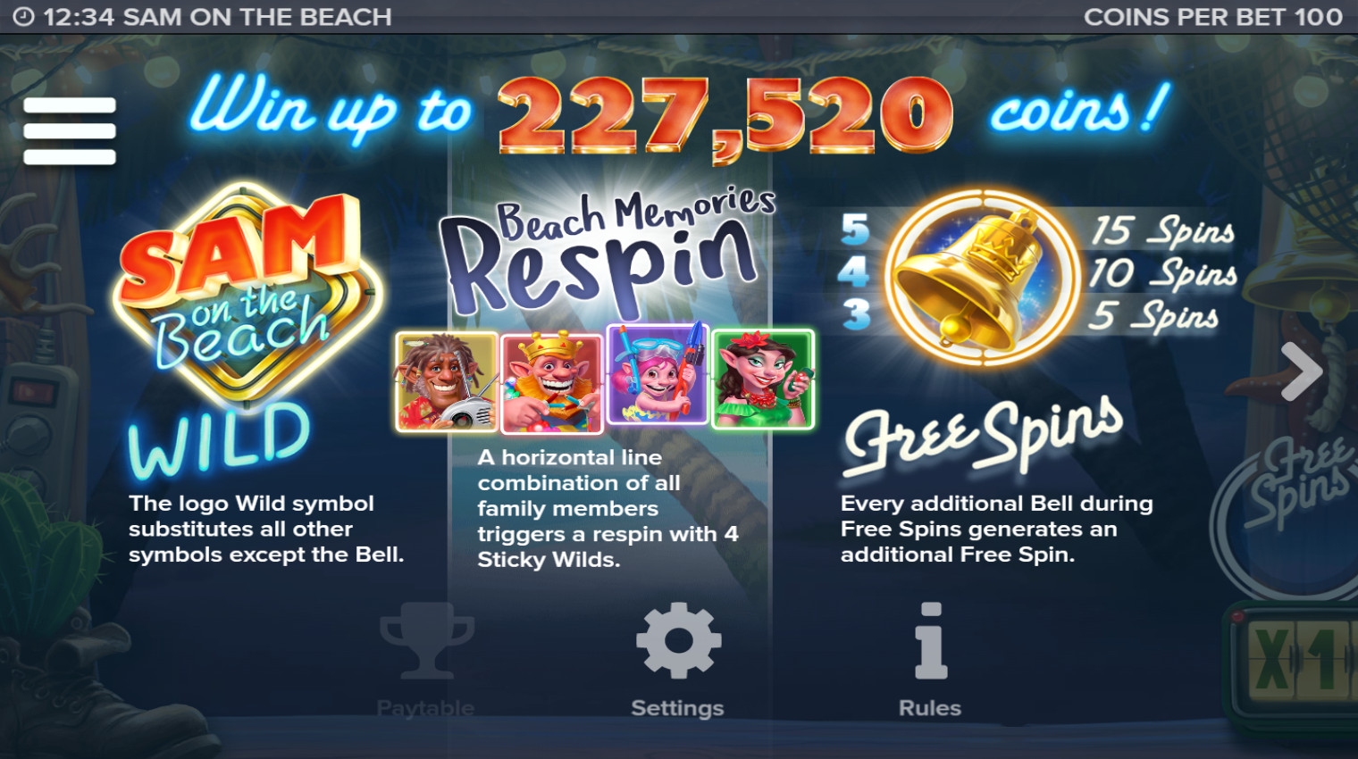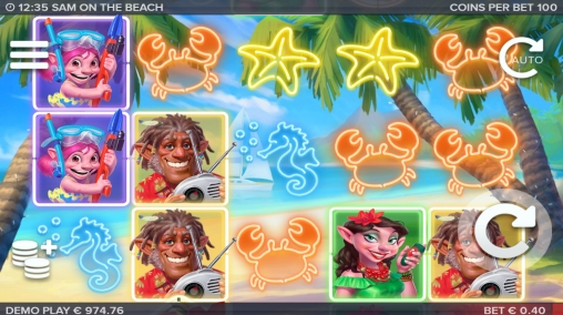 На экране видео-слота Sam on the Beach появляются тролли Сэм, Сандра, Мэгги и Тэд, одетые, как подобает отдыхающим на море. Они задействуются в респинах, о которых идет речь ниже.