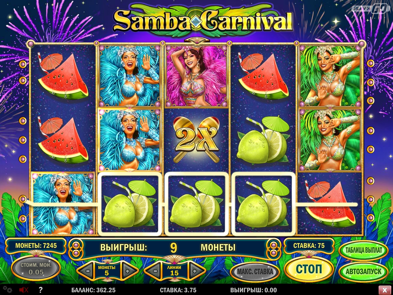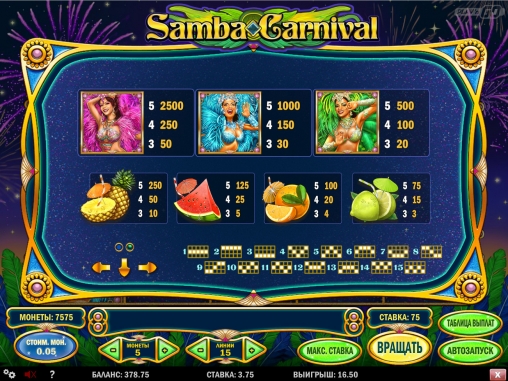 В Samba Carnival пять барабанов, пятнадцать линий для образования комбинаций и три ряда картинок на главном экране (всего пятнадцать).