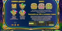 Есть базовые настройки, двухстраничная таблица выплат и дополнительный справочный раздел с подробным описанием всех пунктов правил и технических характеристик игры.