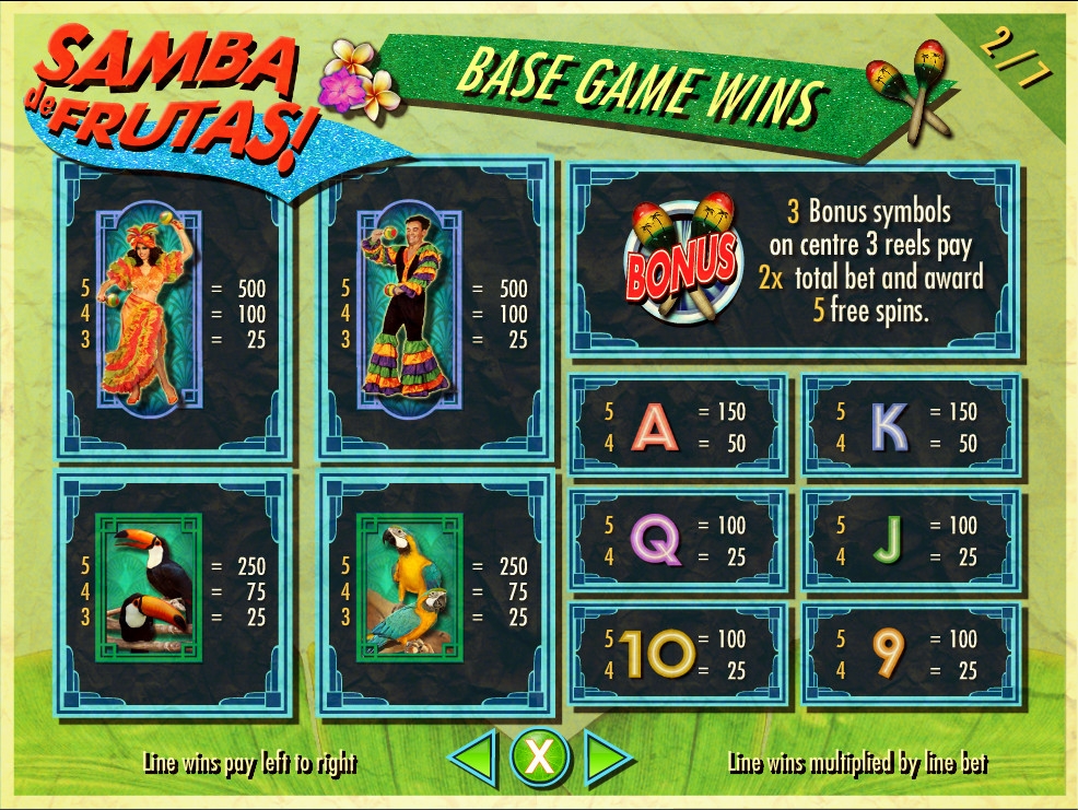Samba de Frutas имеет пять барабанов, сто линий и сорок картинок на основном экране (5х8). Играть можно по одной, восьми, двадцати пяти, пятидесяти, семидесяти пяти или ста активным полосам, сделав на них равные ставки.