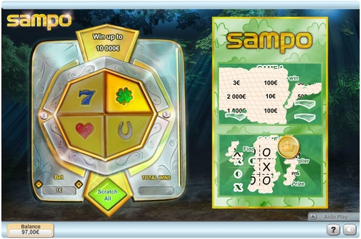 бесплатная скрэтч-карта онлайн, обладающая необычным интерфейсом и радующая интересным игровым процессом. Билет моментальной лотереи Sampo состоит из девяти ячеек, расположенных по схеме 3х3. В ячейках появляются потенциальные суммы выплат.