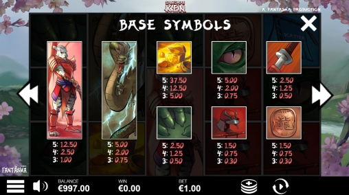 Samurai Ken – видео-слот с пятью барабанами, двадцатью фиксированными полосами и пятнадцатью позициями для картинок на основном экране.