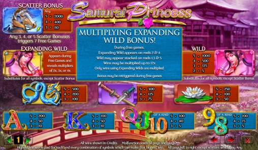 В видео-слоте Samurai Princess есть особые символы Wild (принцесса-самурай) и Scatter (боевой конь).