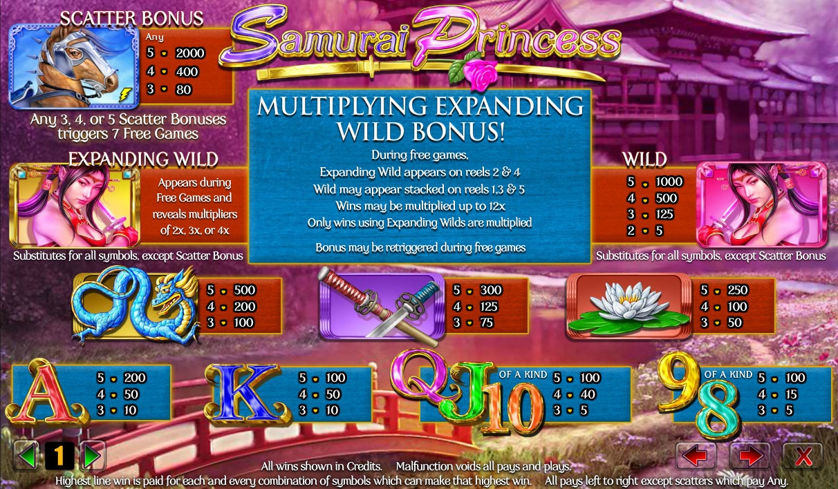 Над барабанами появляются подсказки по игре. В Samurai Princess есть также режим автоматических ставок, базовые настройки и удобная таблица выплат с краткими правилами.