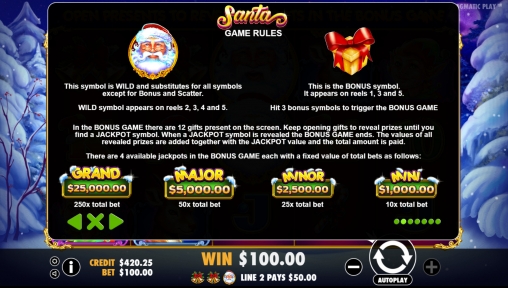 В Santa задействованы девять базовых иконок, два особых символа, бесплатные вращения с призовыми опциями, фиксированные джекпоты и дополнительные бонусы.