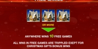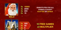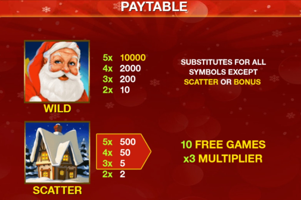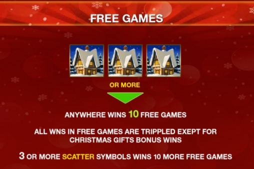 - Scatter - Скаттером служит избушка Санта-Клауса. Стоит появиться на экране хотя двум символам разброса, и это означает увеличение выплаты для игрока. Чем больше их на экране, тем выше коэффициент умножения. Если появляется от трех избушек, также активируются десять бесплатных спинов, во время которых размер выигрыша увеличен втрое. Размер ставки во время бесплатных раундов остается таким же, как он был в предыдущем раунде. Если в течение этих спинов вновь выпадет от трех символов разброса, это добавит дополнительные бонусные запуски.