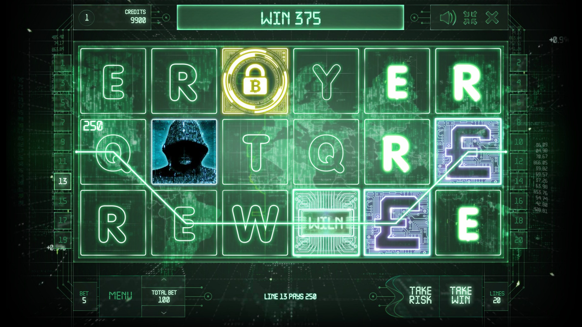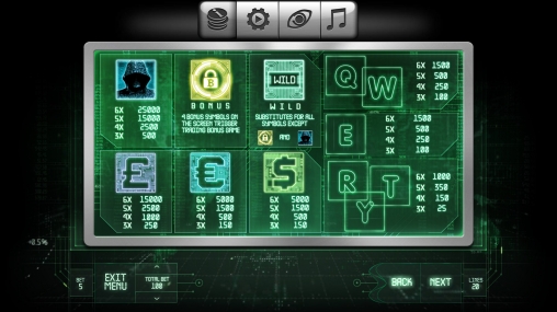 На экране видео-слота появляются выдержанные в соответствующем тематике стиле буквы Q, W, E, R, T, и Y, символы доллара, евро и фунтов, а также загадочная личность, лицо которой скрыто под капюшоном.