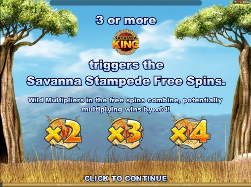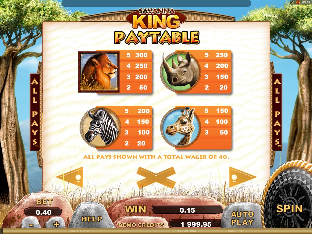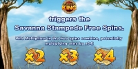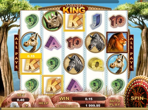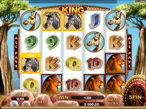 Savanna King представляет собой пятибарабанную модель с четырьмя рядами картинок на экране. Понятия активных линий здесь нет. Формирование оплачиваемых цепочек происходит из картинок, которые появляются в любой позиции на соседних барабанах, начиная с первого слева. Эта функция называется All Pays.