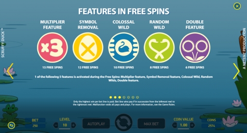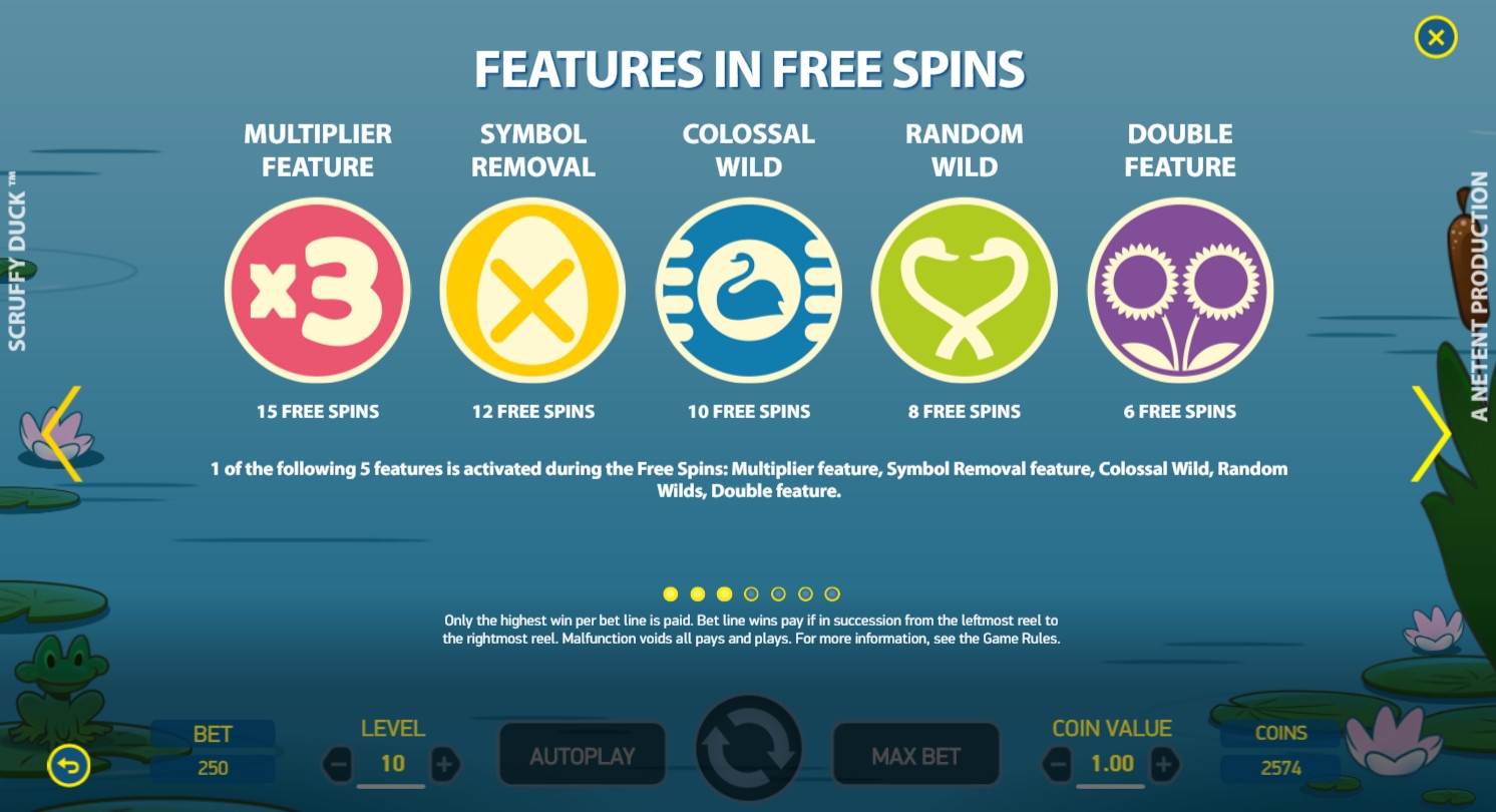 Далее рассмотрим призовые вращения, которые начинаются тремя скаттерами. Они представлены в пяти разновидностях. Перед их началом нужно выбрать одну из уточек, чтобы узнать, в какой именно версии вы будете принимать участие. Варианты таковы: