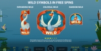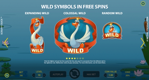 - Wild (утенок-грязнуля) появляется во всех колонках. Он используется лишь для того, чтобы заменять в цепочках другие картинки, за исключением скаттеров. Сам по себе он не образует комбинации. В бесплатных вращениях джокер обладает расширенными функциями.