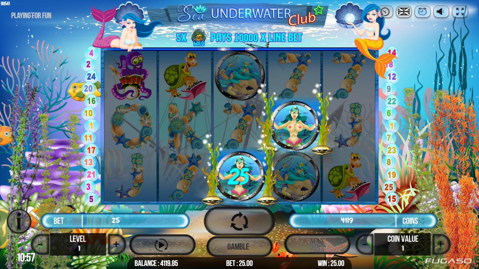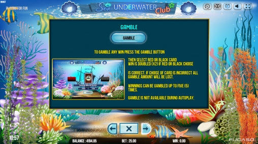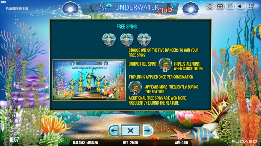 В игровом автомате Sea Underwater Club пять барабанов, двадцать пять активных полос и пятнадцать ячеек для символов на центральном экране.