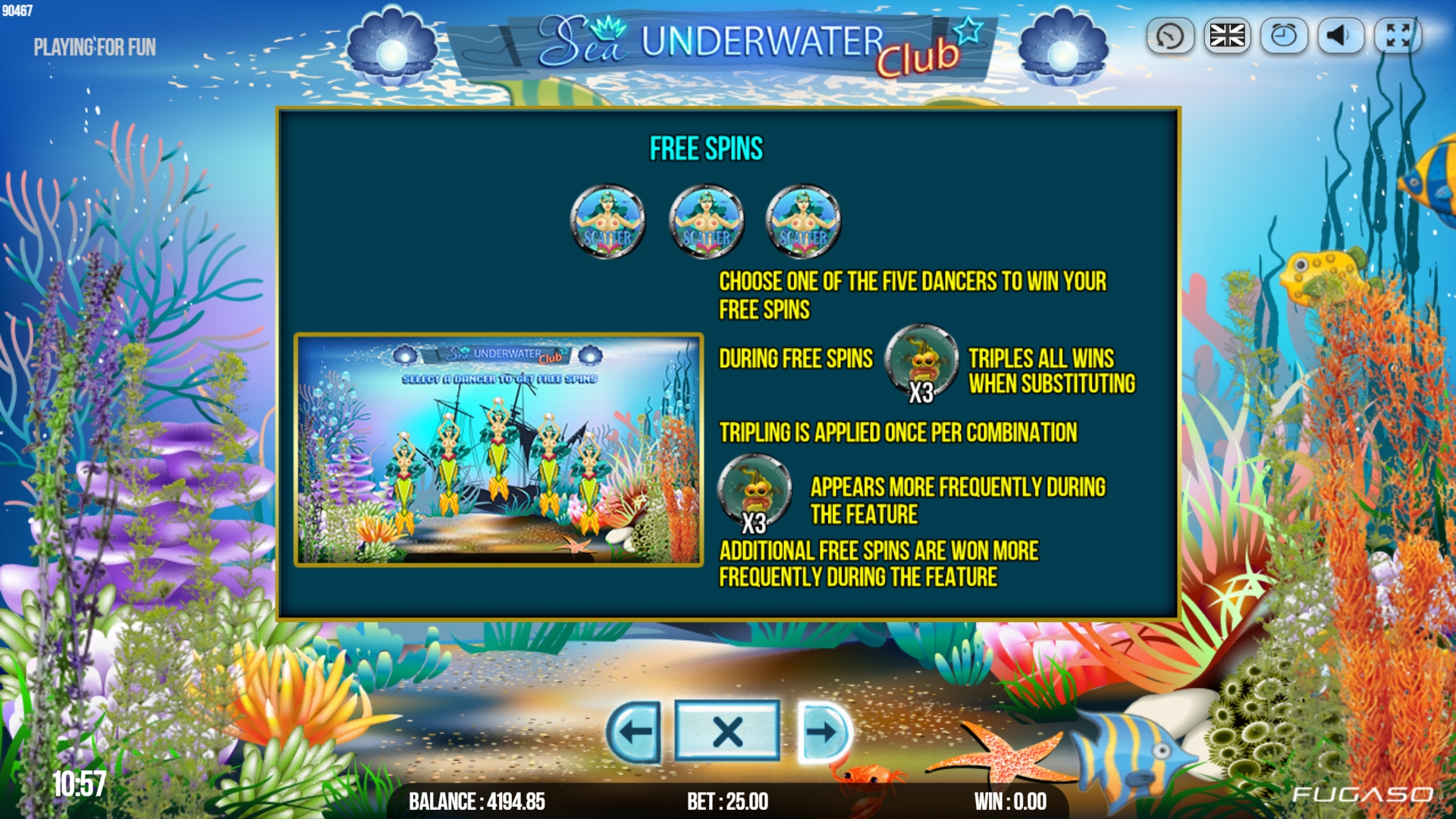 - Free Spins – Сначала появляются пять русалок-танцовщиц. Выберите одну из них, чтобы узнать количество полагающихся вам фри-спинов. Их может быть до двадцати трех. Затем начинаются вращения на деньги казино. Ставка не меняется. Все выплаты утраиваются. Раунд может продлеваться.