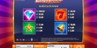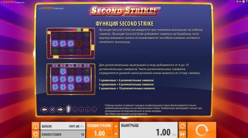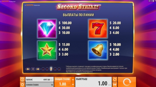 Азартная игра привлекает как всегда хорошими выигрышами, в представленном игровом автомате прекрасная возможность выиграть при совпадении выигрышных комбинаций. В Second Strike самый большой выигрыш 5 бриллиантов 100,00 , необходимо воспользоваться своей удачей.