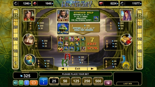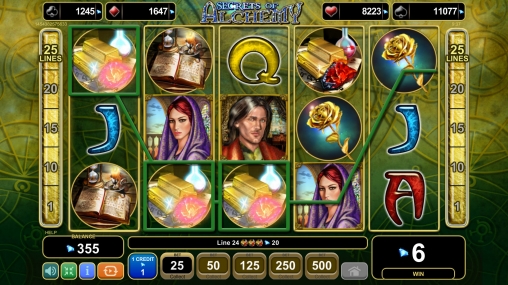В игровом аппарате «Тайны алхимии» пять барабанов, двадцать линий и пятнадцать ячеек для картинок на основном экране.