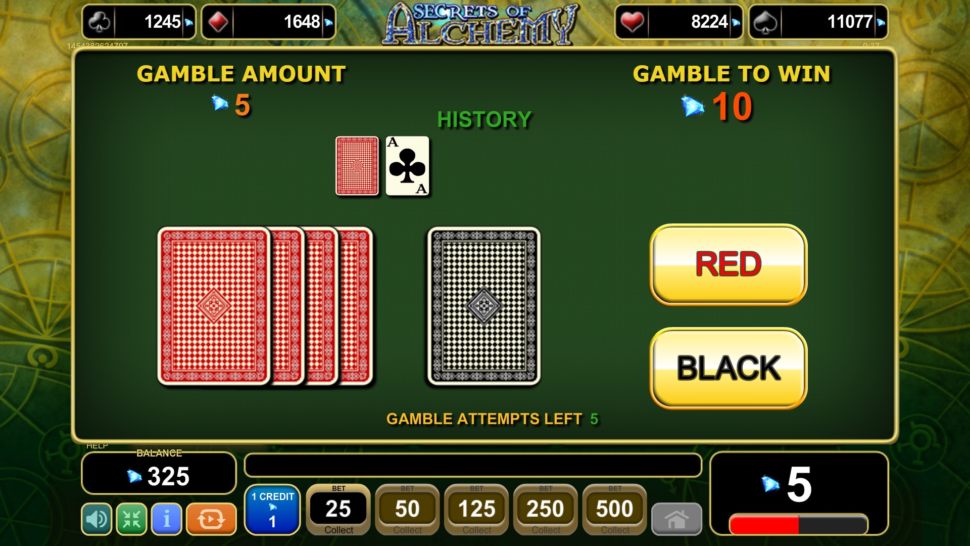Полученные деньги можно вывести на счет или попытаться преумножить в игре по равным шансам. Здесь нужно угадывать цвет карты. Верный ответ удваивает сумму, а ошибка означает проигрыш ставки. Разрешается играть несколько раз подряд.