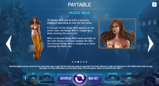 - Wild (русалка) занимает сразу четыре ячейки на барабане. Он не оплачивается сам по себе, но заменяет другие картинки в выигрышных цепочках. Также он участвует в Nudge Wild, о чем рассказывается далее.