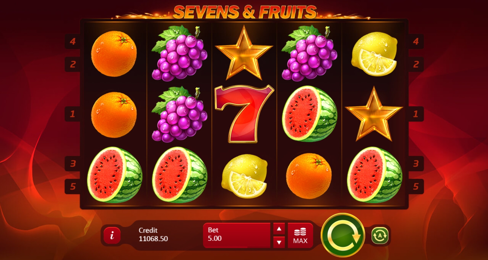 В «Семерках и фруктах» пять барабанов и такое же количество фиксированных активных линий. Символы выстраиваются на экране по сетке 5х3.