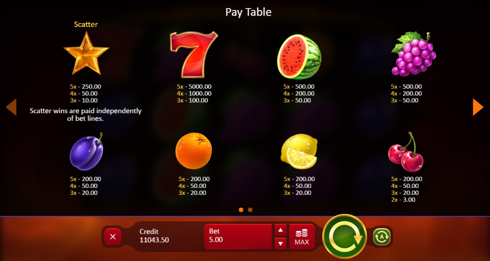 Базовые иконки формируют комбинации слева направо на пяти полосах. Требуются минимум три одинаковых элемента (исключение – вишенки). Учитывается лишь максимальный вариант по каждой позиции. О скаттере читайте ниже.