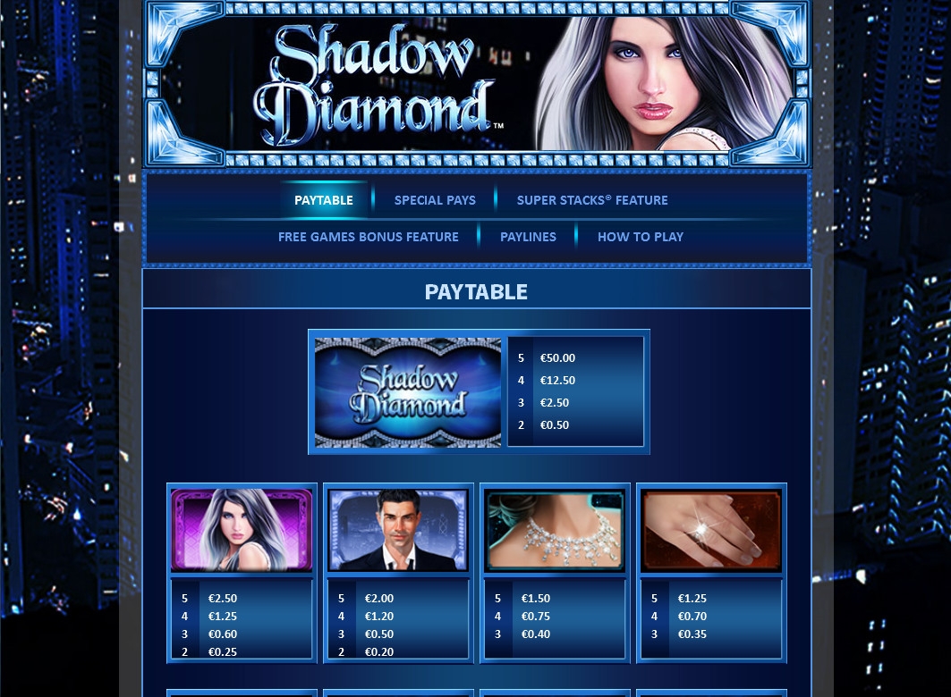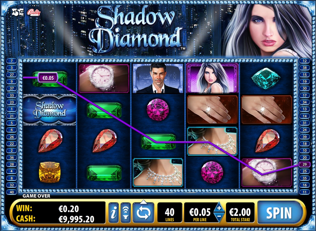 Shadow Diamond – 5-барабанный видео-слот, на экране которого картинки выстраиваются в три ряда. Количество активных линий всегда неизменно.
