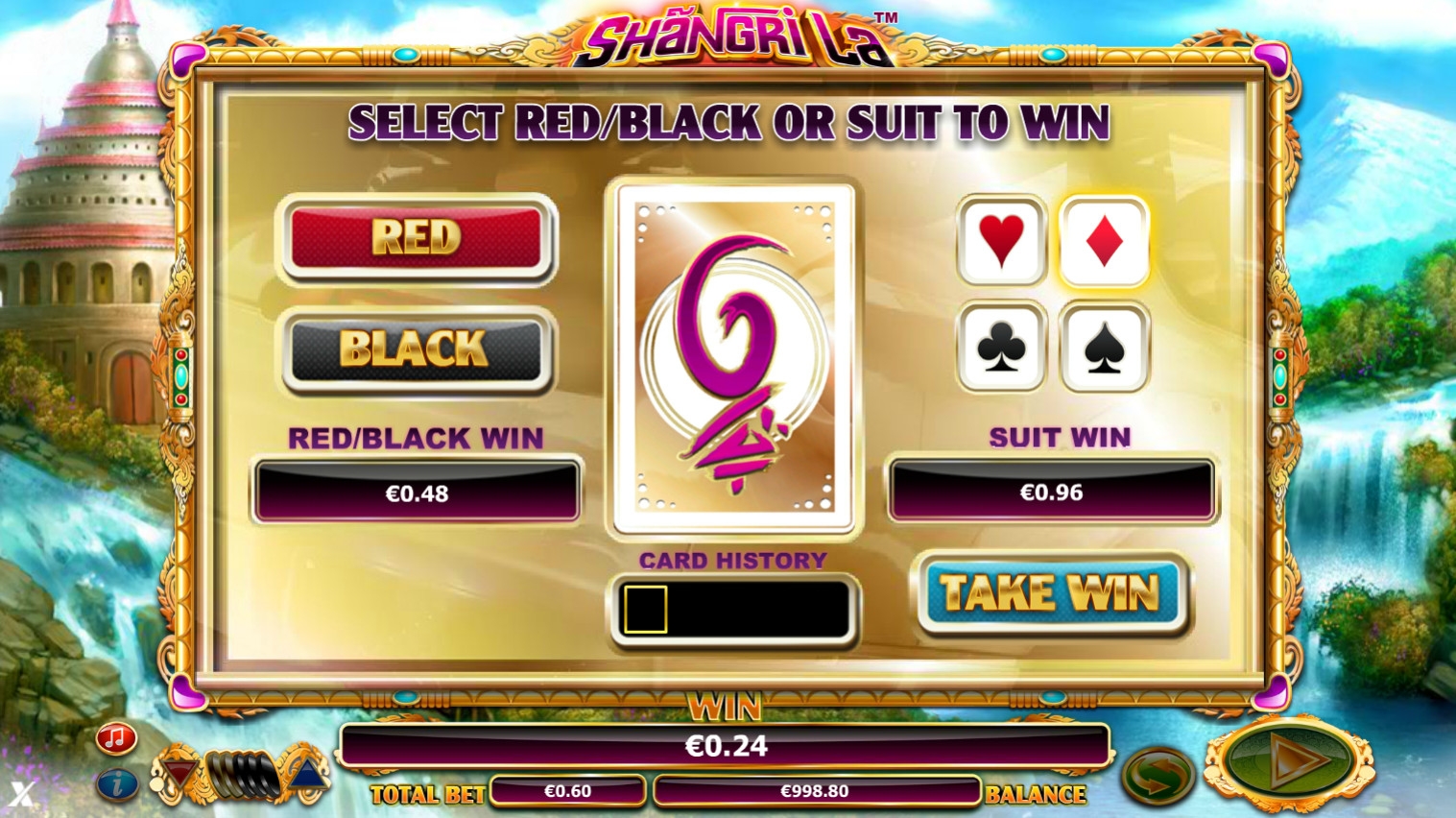 Можно испытать судьбу в риск-игре по равным шансам. В Shangri La она выдержана в типичном для NextGen стиле. Вы будете угадывать цвет или масть карты, чтобы увеличить сумму в два или четыре раза соответственно. Подряд можно играть до пяти раз.