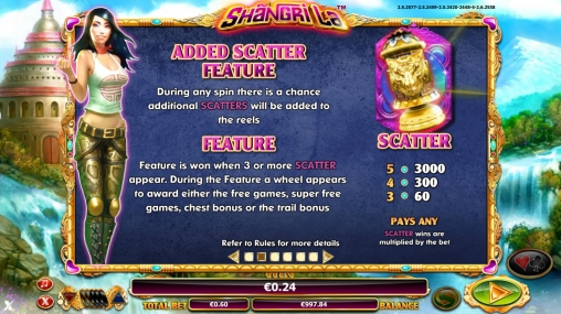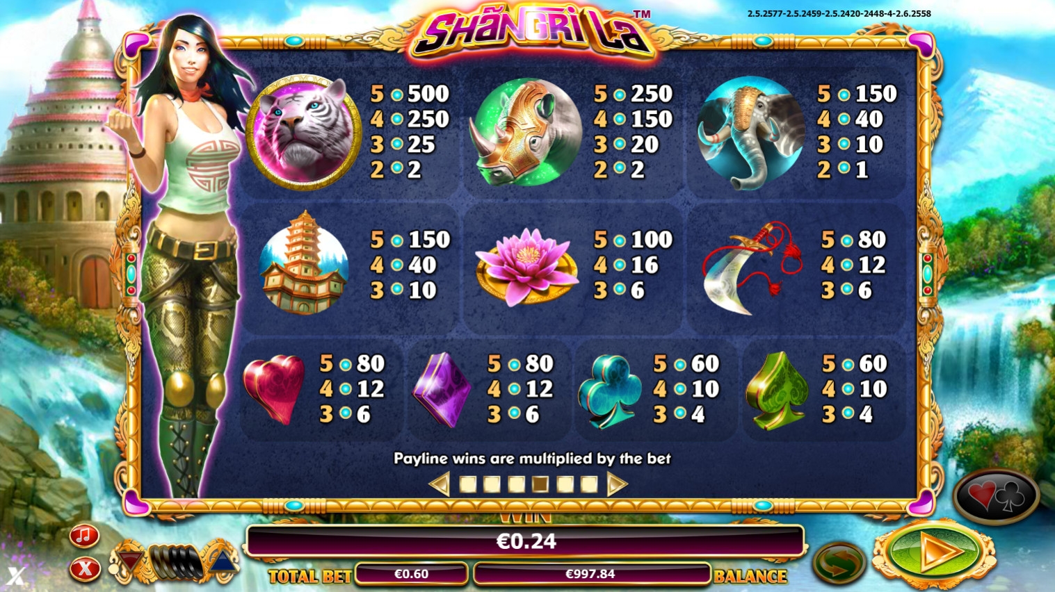 Героиня игрового автомата Shangri La отправилась на поиски мифической страны Шангри-Ла (или Шамбалы). Как гласит легенда, она скрывается в горах Тибета или где-то по близости в Азии. Ее упоминают в преданиях с древних времен, однако нет убедительных доказательств ее существования. Вам предстоит выяснить, удастся ли девушке из видео-слота от NextGen Gaming найти таинственные края.