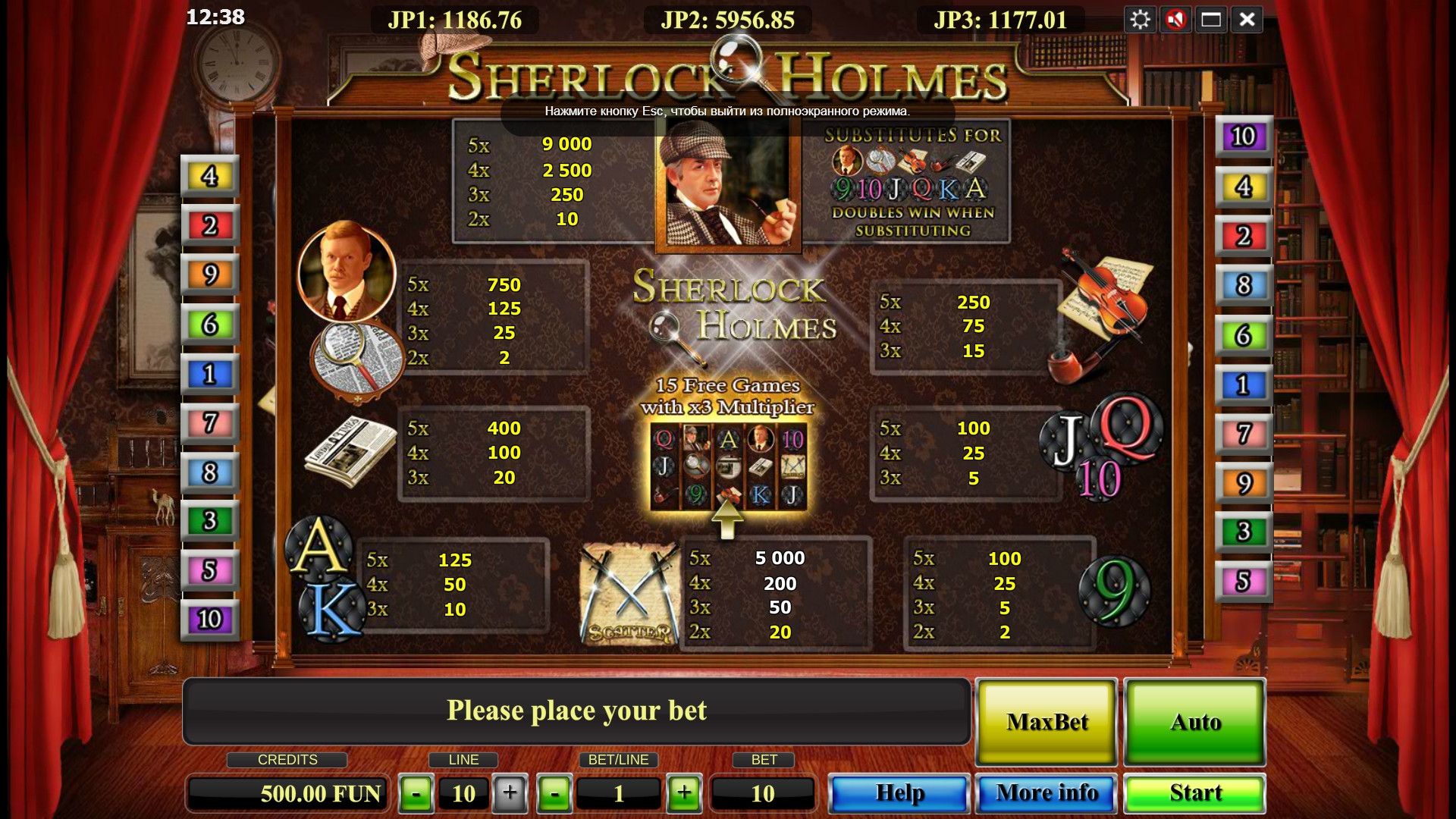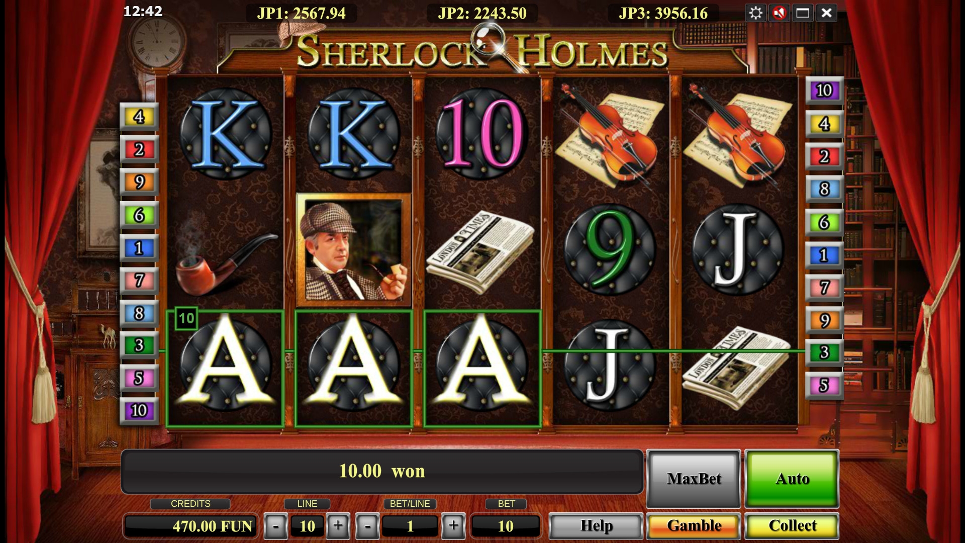 Sherlock Holmes – игровой аппарат с десятью линиями для образования комбинаций, пятнадцатью картинками на экране и пятью барабанами. Вы сможете играть по любому количеству активных полос из числа доступных. Ставки по ним автоматически выравниваются.