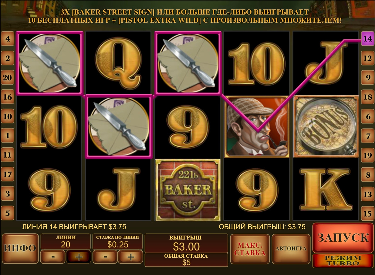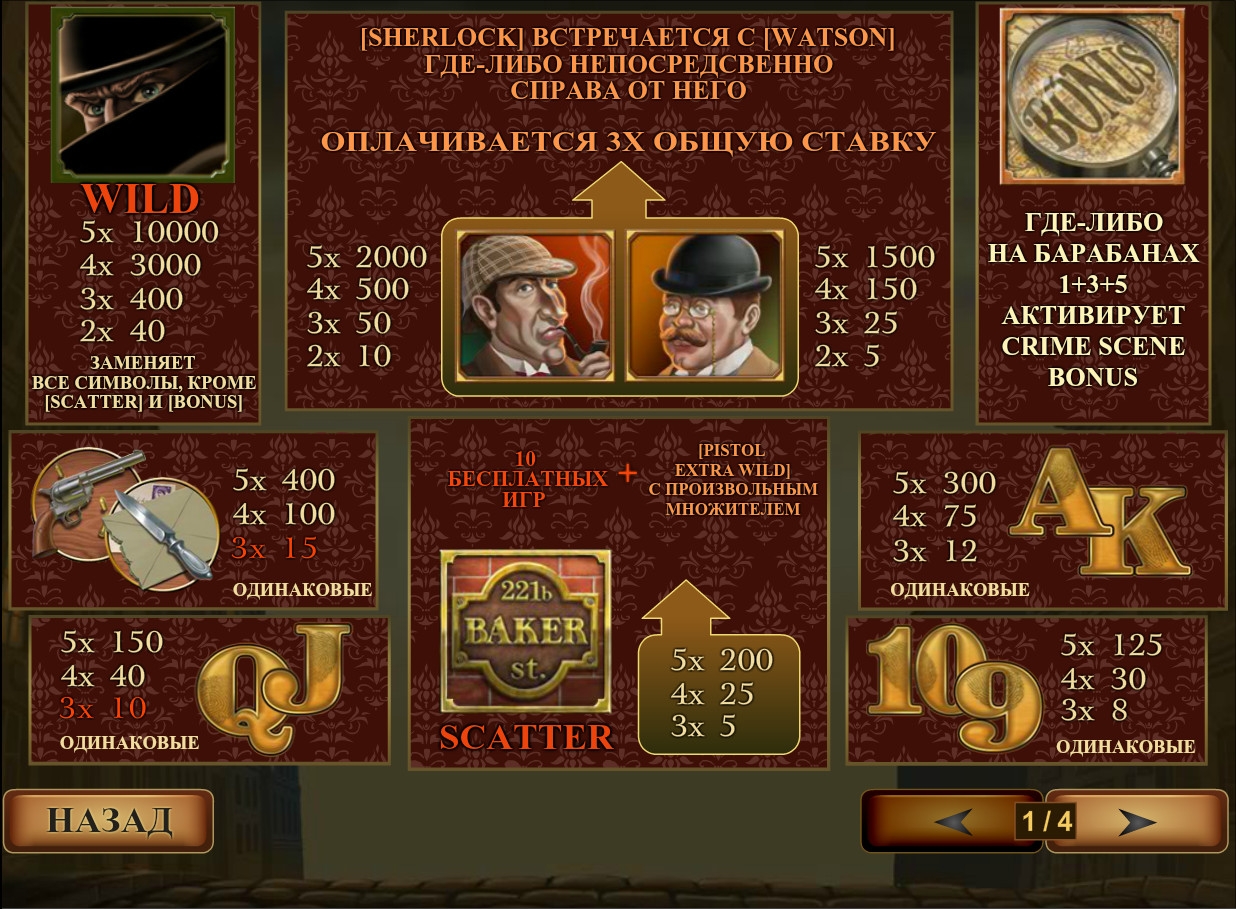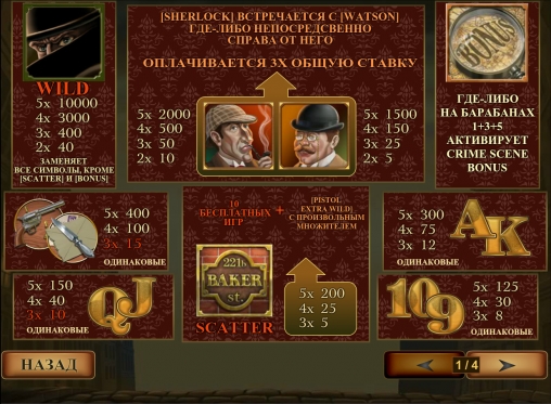 В автомате также есть несколько специальных символов: Wild (преступник), Scatter (вывеска Baker Street 221b) и Bonus (лупа сыщика). Их особенности нужно рассмотреть подробно: