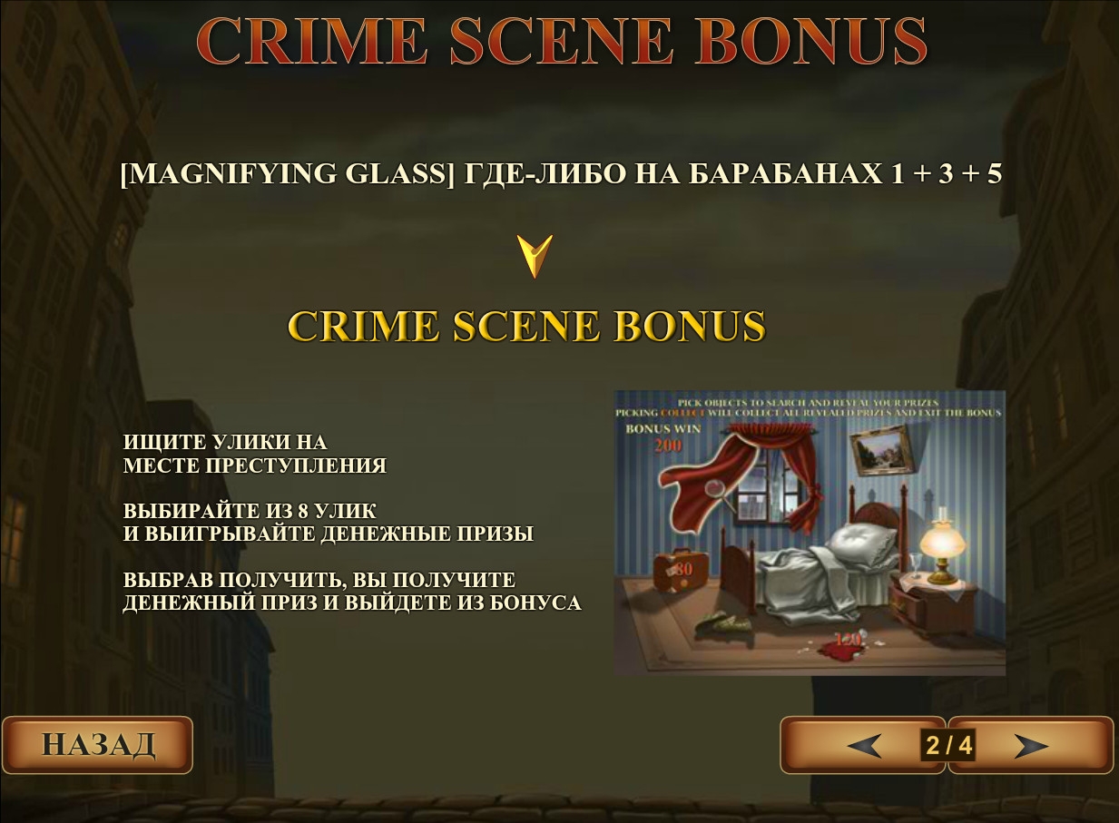 - Bonus выпадает на первом, втором и пятом барабанах. Одновременное появление этих символов на экране запускает бонусный раунд Crime Scene.