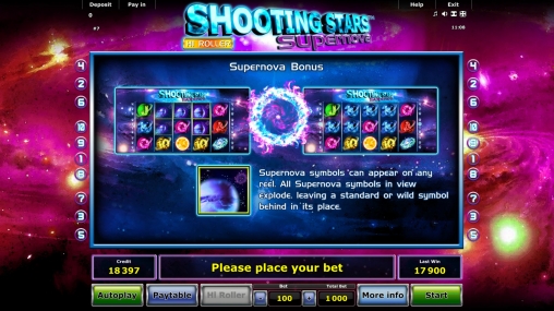 Несколько лет тому назад компания Novomatic выпустила игровой автомат Shooting Stars. Он понравился любителям азартных развлечений интересными бонусами, многочисленными выплатами и приятным дизайном. Теперь знаменитый разработчик предлагает новую версию слота, получившую название Shooting Stars Supernova. От первого варианта она отличается улучшенным дизайном и дополнительными возможностями геймплея. С ними вас познакомит обзор Casinoz.