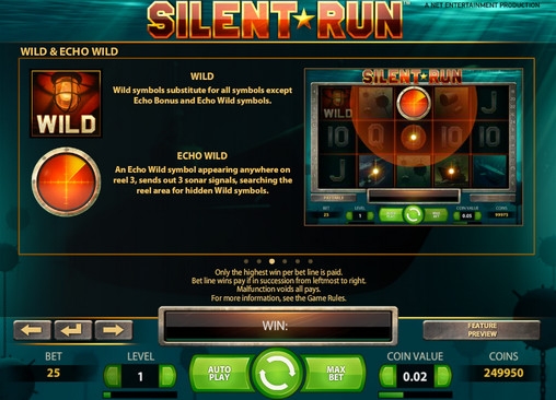 Silent Run – пятибарабанный видео-слот с фиксированными двадцатью пятью линиями и тремя рядами символов на экране. Играть на игровом автомате можно по ставке на линию в одну – десять монет номиналом от одного до пятидесяти центов. Таким образом, на спин принимается до ста двадцати пяти евро.